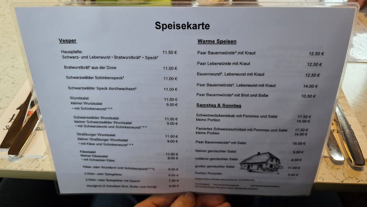 At Schwarzwaldstube - Eselbach (Eselbach 3, 78733 Aichhalden), the menu feels rooted in classic Black Forest comfort food-straightforward, hearty, and built around familiar flavors. The standout Schlachtplatte delivers exactly what you’d hope for from a traditional butcher-style plate: satisfying, rustic, and clearly meant for diners who want something substantial rather than delicate. If you prefer something tangier and lighter, Schwarzwälder Wurstsalat is the kind of dish that balances savory bite with refreshing acidity, making it an easy pick for a casual meal or as a companion to a drink. For a no-risk main that consistently appeals to a wide range of appetites, Schnitzel M Pommes Und Salat Eindach Spitze brings the dependable trio-crispy schnitzel, fries, and salad-into one solid, filling choice that represents the kitchen’s uncomplicated, crowd-pleasing style. Overall, the menu comes across as confidently traditional, focusing on bold portions and recognizable regional staples rather than overcomplication.